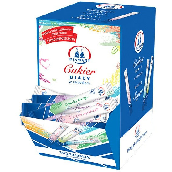 DIAMANT Cukier biały w saszetkach to drobny, łatwo rozpuszczający się, segregowany cukier biały pierwszej kategorii, pakowany w podłużne, higieniczne, estetyczne saszetki. Doskonale nadaje się do hoteli, restauracji, barów, zakładów zbiorowego żywienia oraz szpitali. Niezbędny podczas konferencji, spotkań biznesowych lub towarzyskich, niezastąpiony w podróży. W opakowaniu znajduje się 200 saszetek. Produkt pakowany jest w kartonik 1 kg.