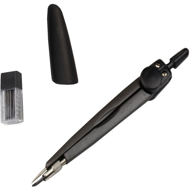 Cyrkiel szkolny długości 135mm, z pojemnikiem z grafitami i plastikową nakładką zabezpieczającą grafit i igłę.