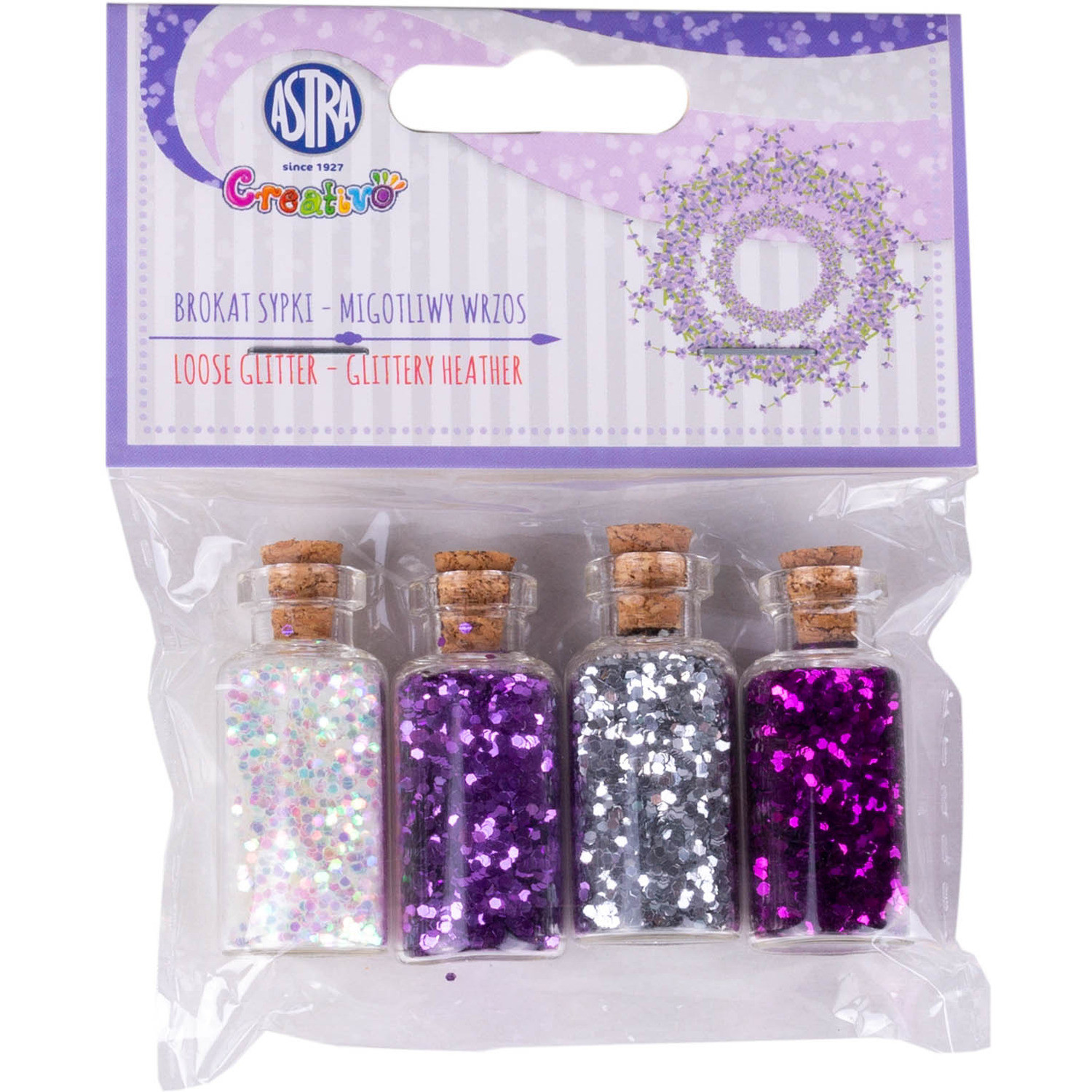 Zestaw 4 brokatów sypkich w pięknych odcieniach fioletu i bieli. Wspaniale sprawdzą się przy tworzeniu prac kreatywnych takich jak kartki okolicznościowe, ozdoby świąteczne czy albumy. Idealny do ozdabiania kul i jajek styropianowych. Zamknięty w urocze szklane buteleczki z korkiem, które mogą być dodatkową ozdobą.