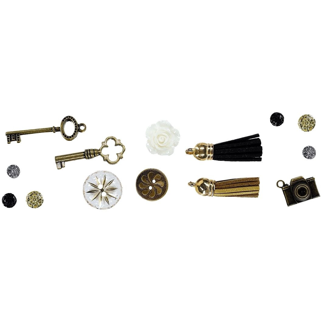 Zestaw dekoracyjny: 2x frędzelki z rzemyków czarny i złoty 10x40mm, 2x klucze 8x42/11x38mm, 1x zawieszka aparat 20x15mm; naklejki 1x guzik ?17mm, 1x guzik kryształowy 22mm, 1x róża biała 20mm, 7x kryształki srebrne, złote, czarne. 14 sztuk.