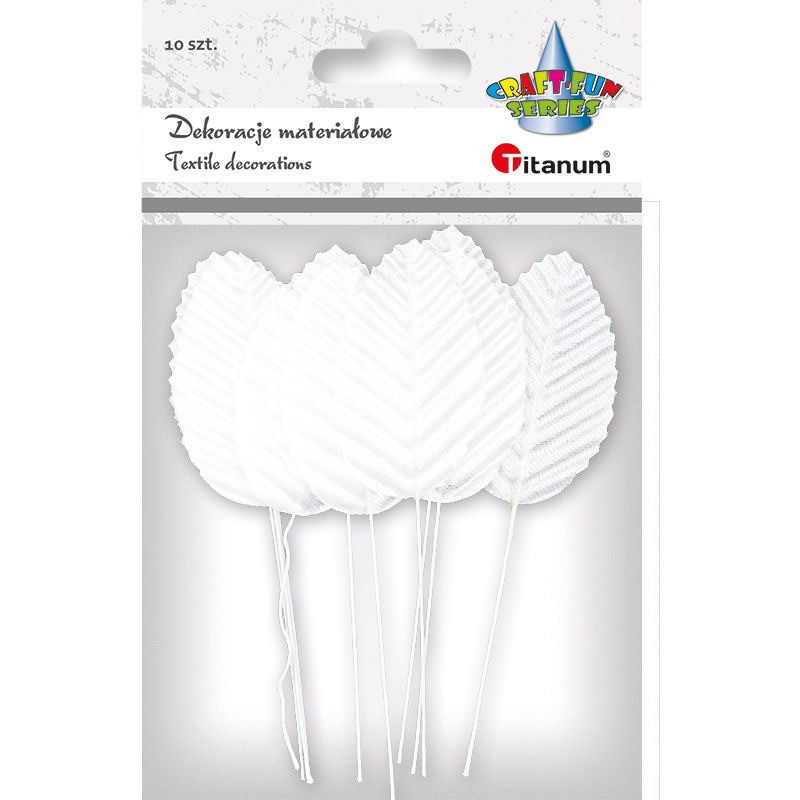 Materiałowe liście na druciku florystycznym. Niezastąpione przy dekorowaniu aranżacji kwiatowych: bukietów, wianków, stroików, itp. Wymiary liścia: 30 x 50 mm, długość drucika: ok. 60 mm. 10 szt.
