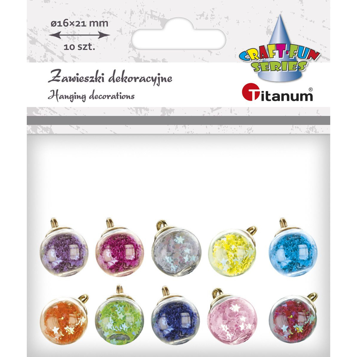 Zawieszki dekoracyjne kule plastikowe, średnica 16 mm, wysokość z zawieszką 21 mm, złote wykończenie, wypełnione konfetti w kształcie gwiazdek, mix kolorów. 10 sztuk.