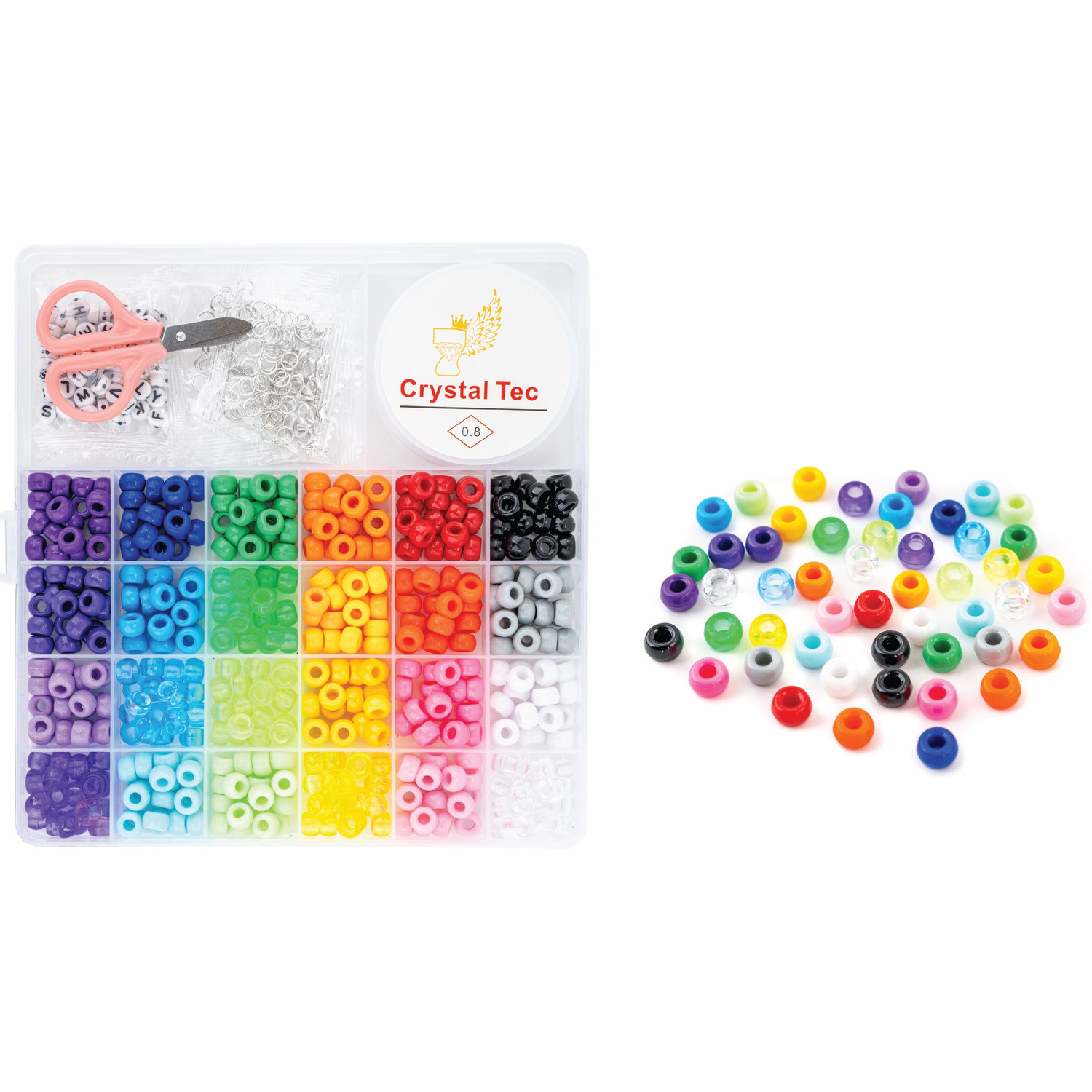 Zestaw biżuteryjny w zamykanym pudełku, zawierający: Koraliki 6mm x 9mm, otwór 4mm, mix 24 kolorów x 5g Koraliki z literkami 7mm, otwór 1mm, 10g 20 zapięć 50 ringów 40 zacisków Żyłkę elastyczną, silikonową 0,8nn o dł. 10m Nożyczki Wymiary pudełka: 20cm x 19cm x 1,8cm