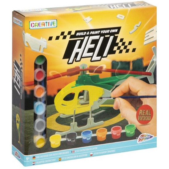 Drewniany helikopter konstrukcyjny, w zestawie 6 farb i pędzelek. Wymiary opakowania: 26 cm x 5 cm x 26 cm. Helikopter do złożenia z drewnianych puzzli, efekt 3D. Drewniane elementy można zostawić surowe, bądź pomalować je załączonymi do zestawu farbami. W opakowaniu 6 kolorów farb i pędzelek. Stworzony własnoręcznie helikopter może posłużyć do zabawy lub posłużyć jako dekoracja kolekcjonerska. Przeznaczone dla dzieci powyżej 5 roku życia.