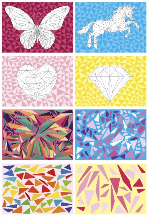 Naklejanie po numerach – wypełnianie kolorem, obrazki w formacie A4. W zestawie 4 arkusze, wzór Motyl (Motyl, Serce, Diament, Jednorożec). Dla dzieci powyżej 7 roku życia.