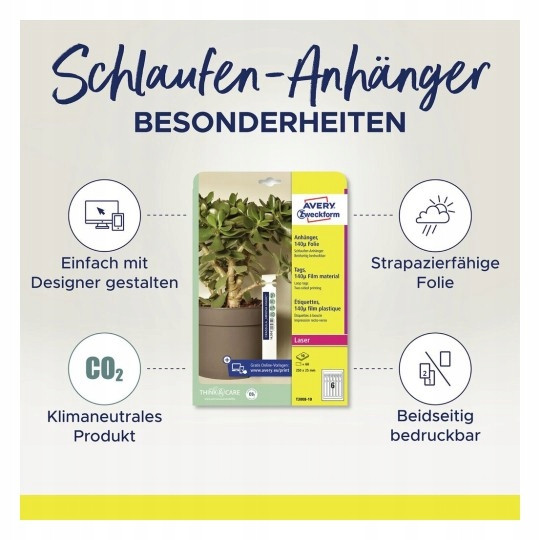 Biale, dwustronne, etykiety petelkowe do roślin Avery Zweckform. Etykiety są wodoodporne i idealnie nadają sie np. do oznaczania krzewów, drzew i innych roślin w szkólkach, centrach ogrodniczych lub marketach budowlanych.