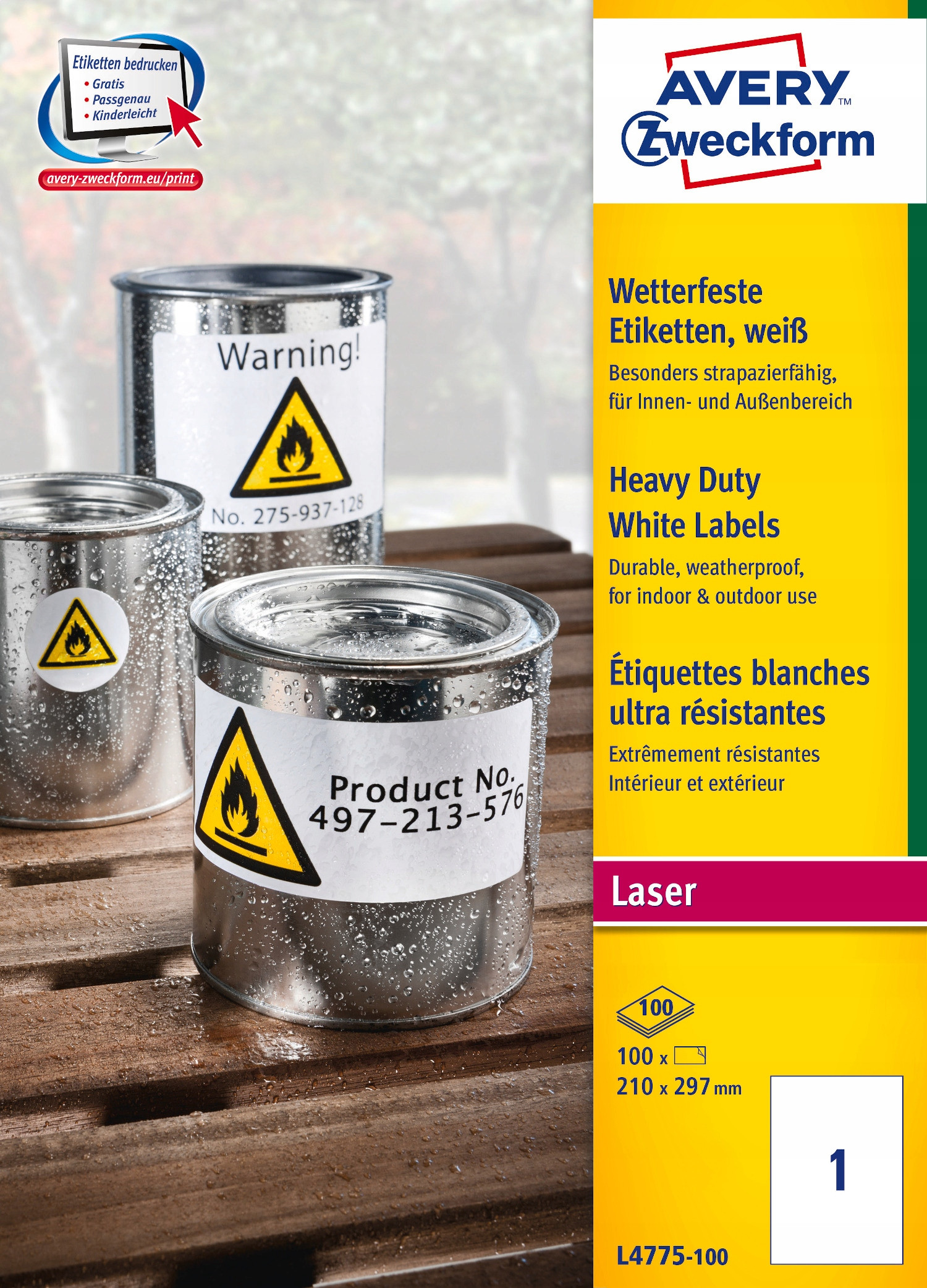 Wysoka jakośc od eksperta w dziedzinie etykiet: biale, odporne na warunki atmosferyczne etykiety Avery Zweckform do drukarek laserowych są szczególnie wytrzymale i nadają sie równiez do uzytku zewnetrznego.