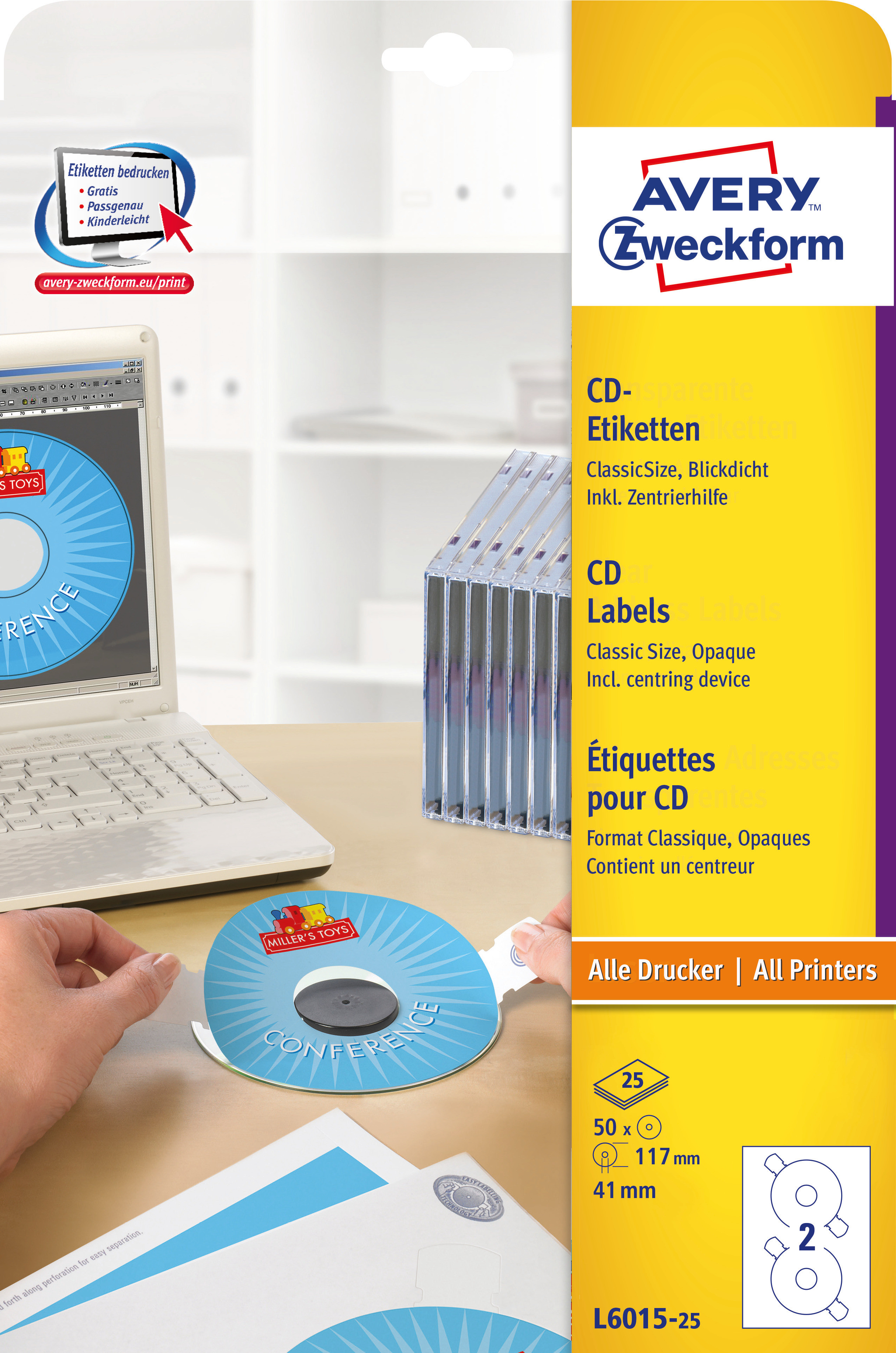 Etykiety na płyty CD • Etykiety do indywidualnego oznaczania płyt CD w rozmiarze ClassicSize – etykiety pokrywają powierzchnię płyty CD z wyłączeniem jej środkowej przezroczystej części. • Wyposażone są w praktyczne uchwyty po bokach, pozwalające prosto wycentrować etykietę na płycie. W opakowaniu znajduje się pomocnik centrujący. • Kryjący materiał całkowicie zasłania stare napisy i oznaczenia pod spodem. • Etykiety z certyfikatem FSC – z papierem z ekologicznie zarządzanych zasobów leśnych. • Przeznaczone do wszystkich typów drukarek atramentowych, laserowych i kopiarek. • Darmowe i łatwe w