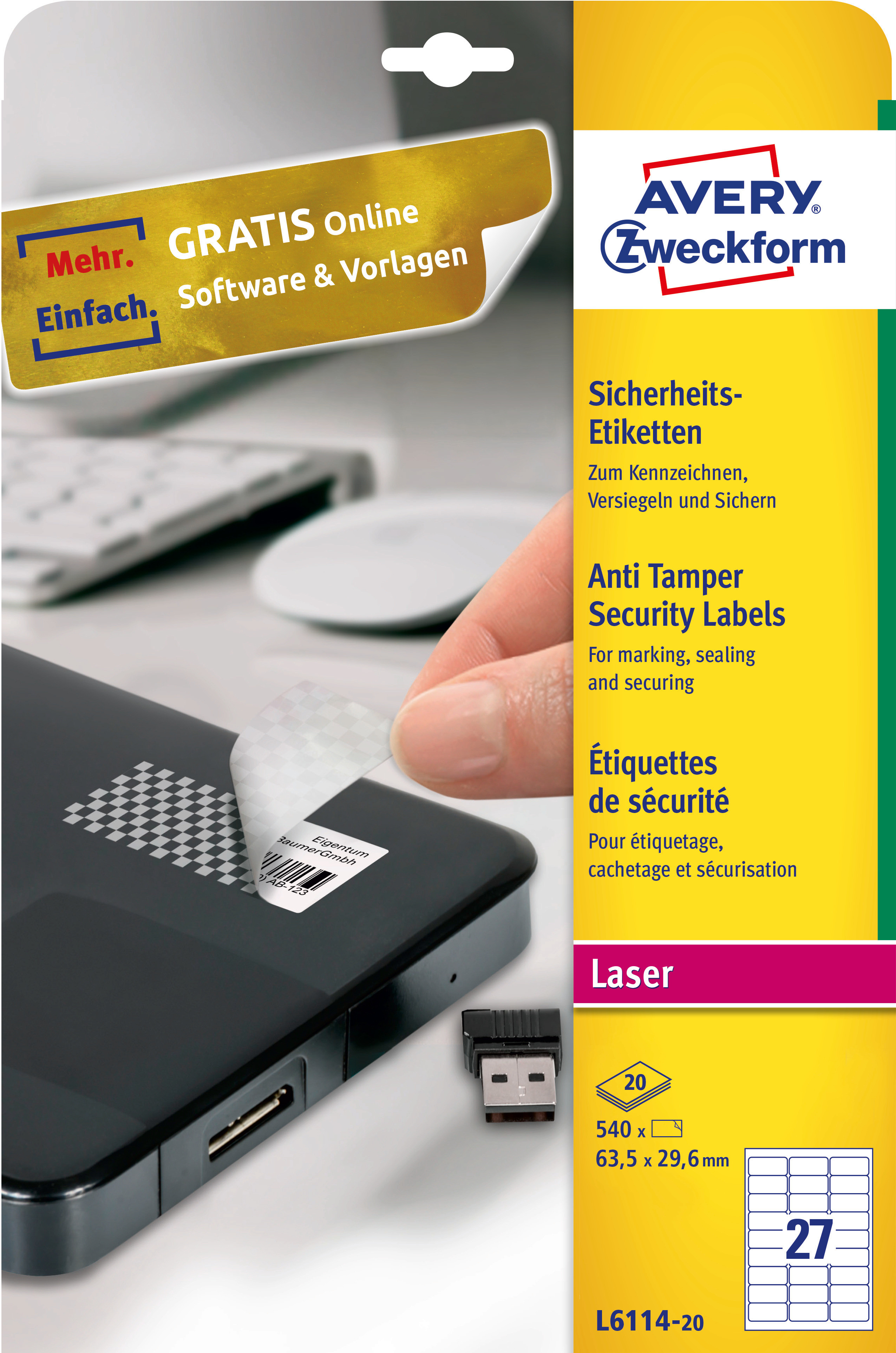 ETYKIETY ZABEZPIECZAJĄCE - PLOMBY • Zabezpieczają mienie osobiste, po oderwaniu etykiety pozostawiają wzór szachownicy i nie dają się ponownie nakleić. • Doskonałe do zabezpieczania urządzeń elektronicznych, sprzetów oraz mebli biurowych, a także CD. • Wodoodporne, odporne na działanie smarów, brudu i temperaturę od -40°C do +80°C. • Przeznaczone do drukarek laserowych oraz kserokopiarek. • Darmowe i łatwe w użyciu szablony oraz oprogramowanie dostępne na www.avery-zweckform.pl.