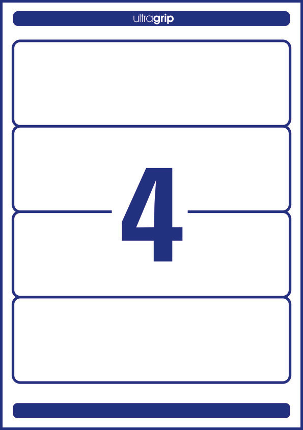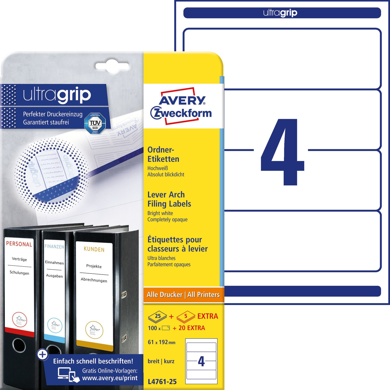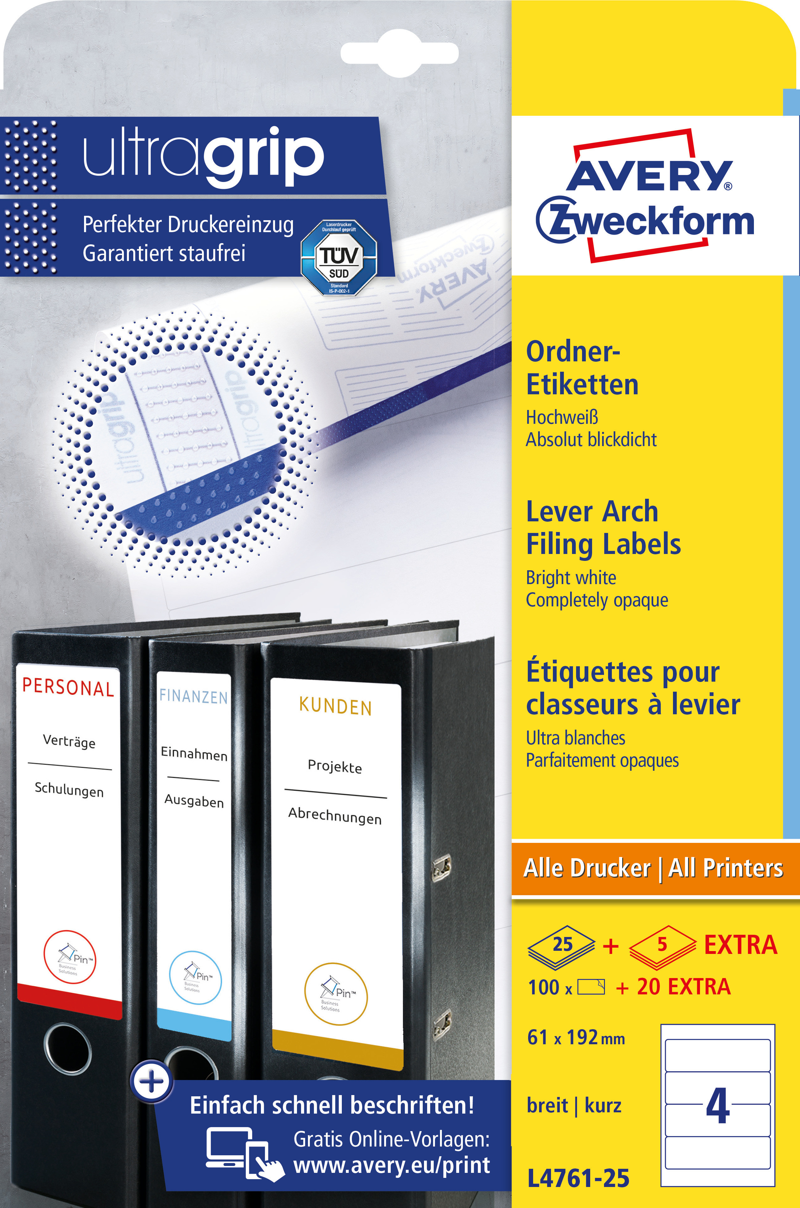 ETYKIETY NA SEGREGATORY, SZEROKIE, KRÓTKIE • Posiadają unikalną i nowoczesną technologię UltraGrip: trójwymiarowa powierzchnia na arkuszach gwarantuje równomierne pobieranie i prowadzenie etykiet w drukarce • W opakowaniu znajduje się aż 5 dodatkowych arkuszy EXTRA! • Kryjący materiał zasłania stare oznaczenia, więc można wielokrotnie wykorzystywać te same segregatory • Silnie przylegają do grzbietu segregatora • Pasują do większości szerokich, krótkich segregatorów dostępnych na rynku • Wysokiej jakości biały papier premium gwarantuje elegancki i profesjonalny wygląd etykiet • Gwarantowany br