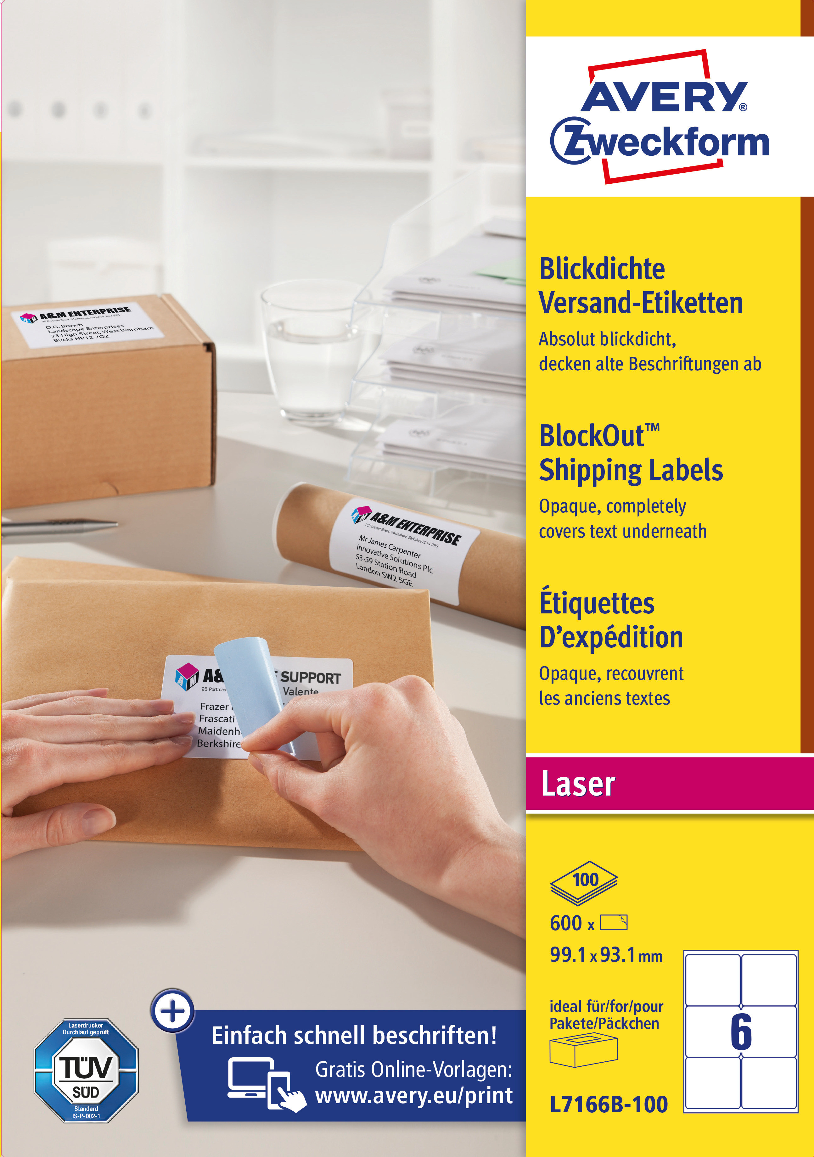 Biale, kryjące etykiety wysylkowe BlockOut do drukarek laserowych marki Avery Zweckform są idealne do oznaczania duzych paczek i przesylek. Nieprzezroczyste naklejki niezawodnie zakrywają stare etykiety - idealne do ponownego wykorzystania opakowan i kartonów.