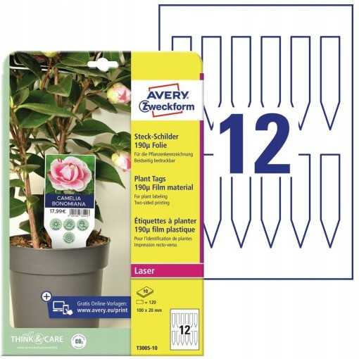 Biale, dwustronne, foliowe tabliczki do oznaczania roślin Avery Zweckform T3005-10 do zadruku, w formacie 100 x 20 mm.