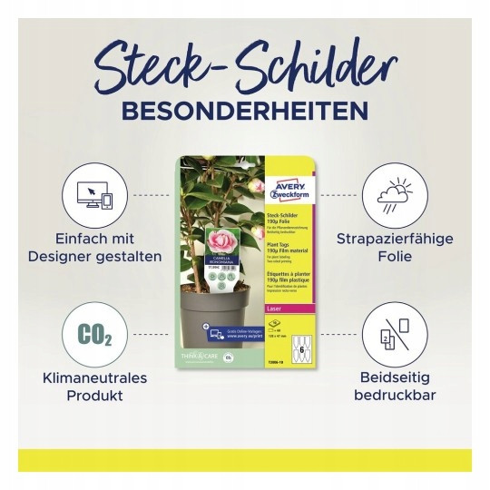 Tabliczki foliowe do oznaczania roślin mozna dwustronnie zadrukowac, dzieki czemu idealnie nadają sie do zamieszczania dodatkowych informacji na odwrocie. Latwe i wygodne w uzyciu: po wydrukowaniu arkuszy A4 pojedyncze tabliczki mozna latwo oddzielic od arkusza.