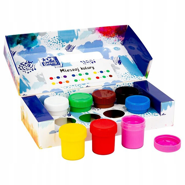 Farby plakatowe Oxford doskonale sprawdzą sie w kazdej szkole, przedszkolu czy pracowni artystycznej. Poza intensywnymi kolorami i gestą konstystencją Oxford stawia na wysoką jakośc opakowan. W kubeczkach zastosowano pelny gwint, dzieki czemu wieczko zakreca sie szczelnie, bez przekrecenia.