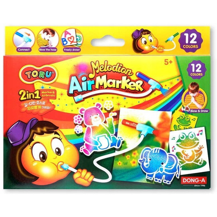 Zawiera 12 kolorów markerów w zestawie z rozpylaczem i szablonami.