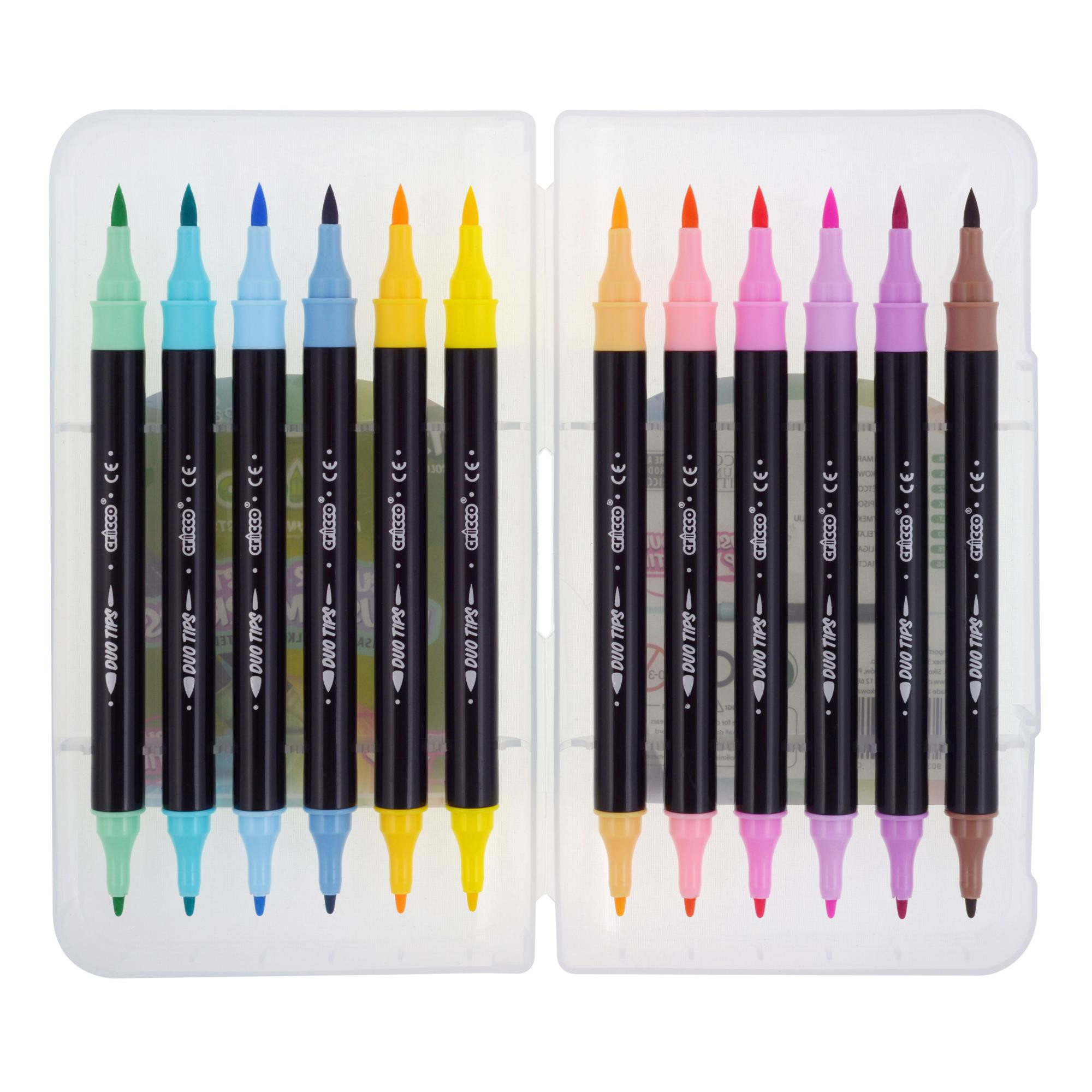 Dwustronne pisaki Cricco z jedną cienką końcówką w formie flamastra oraz drugą, miękką, pędzelkową końcówką. Z syntetycznego włosia, umożliwiającego przyjemne i precyzyjne kolorowanie. Pastelowe, delikatne kolory doskonale nadają się do dekoracji na różnych powierzchniach. Zestaw 12 kolorów w praktycznej, plastikowej kasecie.