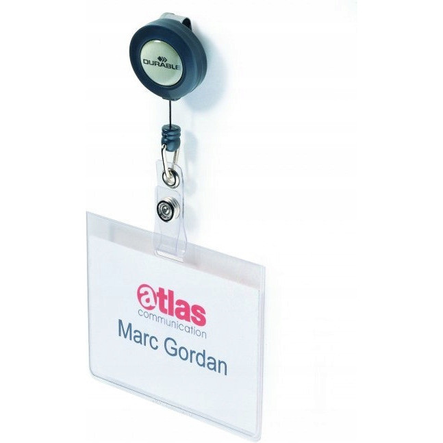 Identyfikator z mechanizmem ściągającym jojo z metalowym klipsem na odwrocie i petelką na zatrzask.