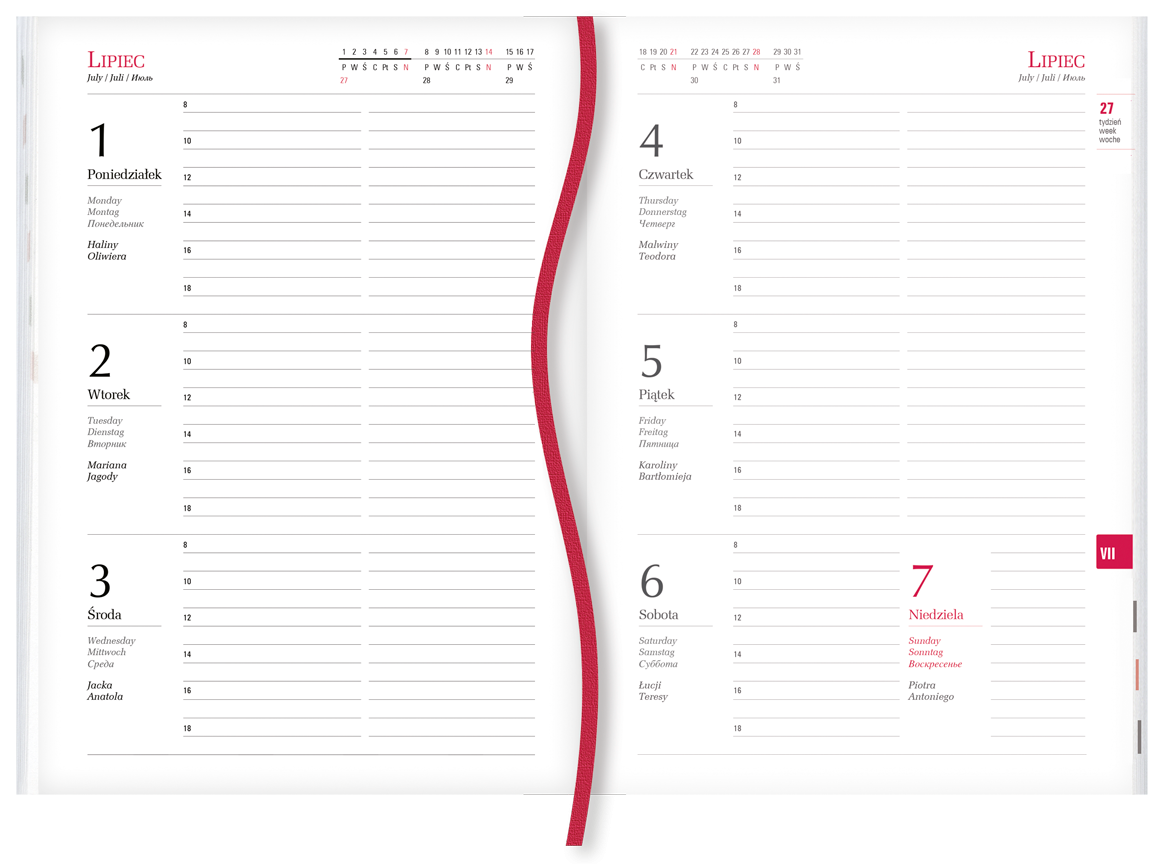 Terminarz ten posiada kalendarium w ukladzie 1 tydzien - 2 strony, co zapewnia duzo miejsca na zaplanowanie i zapisanie wszystkich waznych dat i wydarzen.