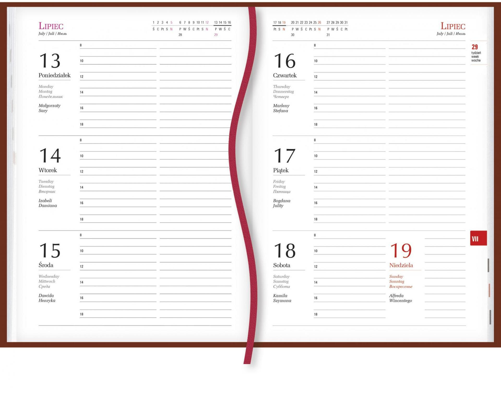 Terminarz ten posiada kalendarium w ukladzie 1 tydzien - 2 strony, co zapewnia duzo miejsca na zaplanowanie i zapisanie wszystkich waznych dat i wydarzen.