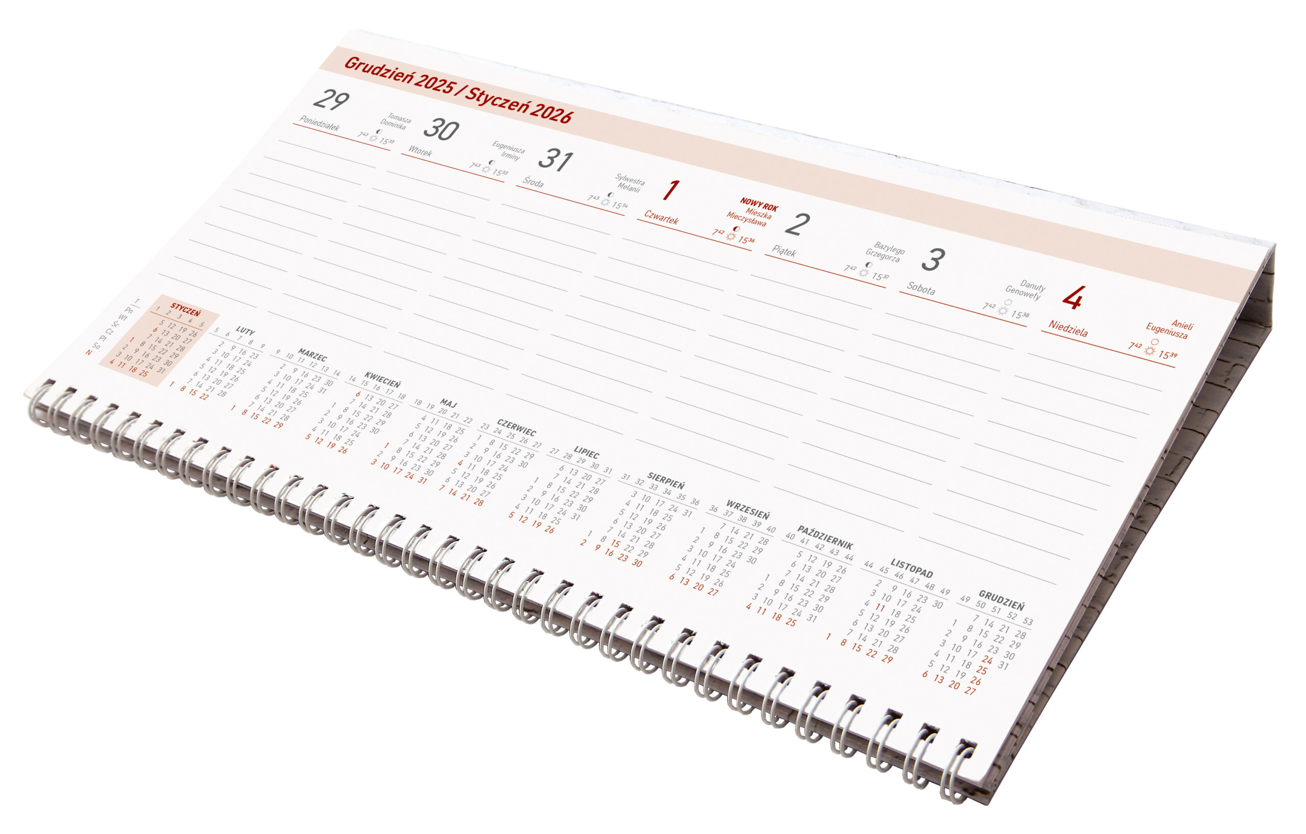 Kalendarz leżący, popularny zwłaszcza w biurze. Zawiera poręczne kalendarium w układzie tygodniowym z dużą powierzchnią do notowania. W dolnej części kalendarium skrócone kalendarium całego roku.