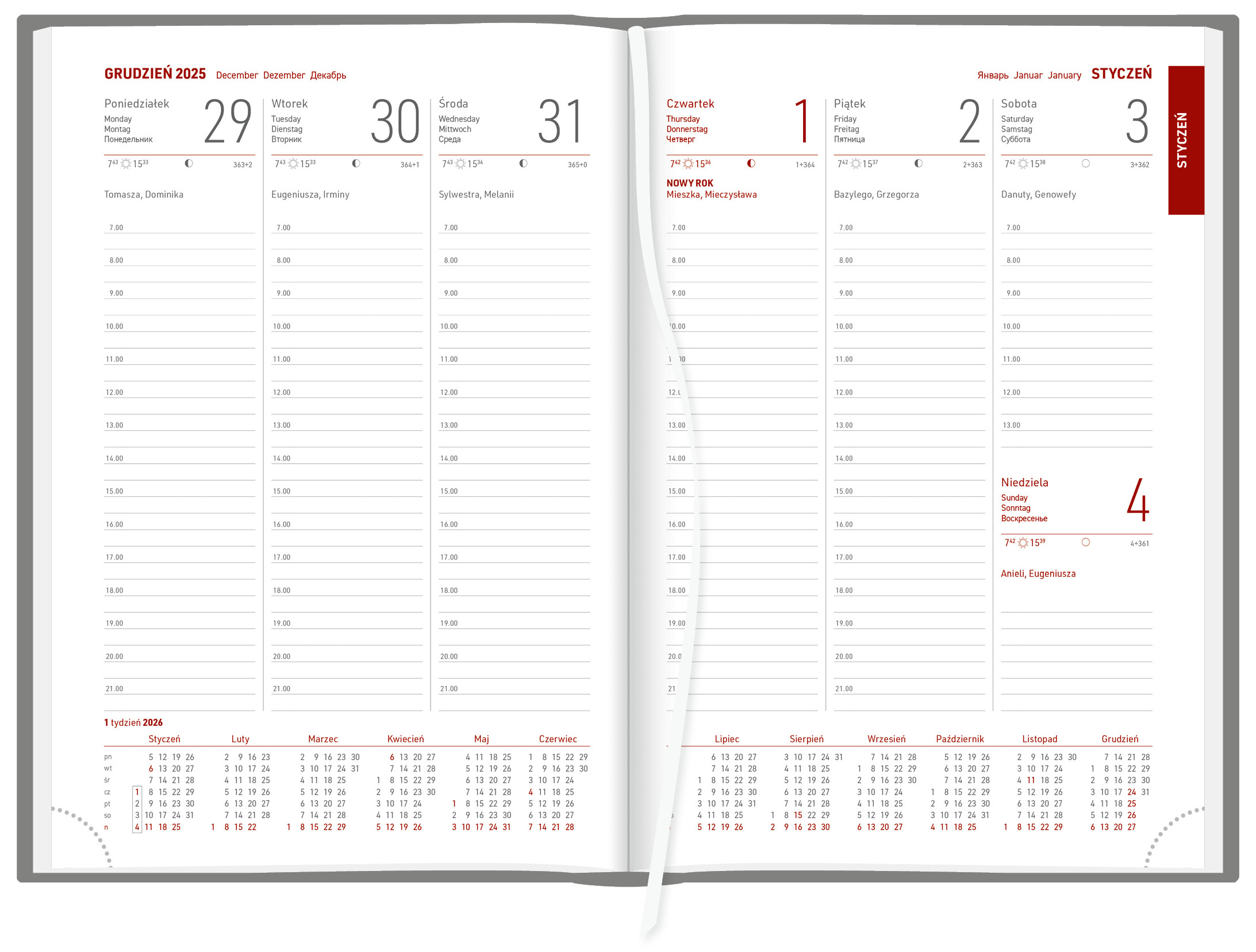 • kalendarium w językach: PL, GB, D, RUS