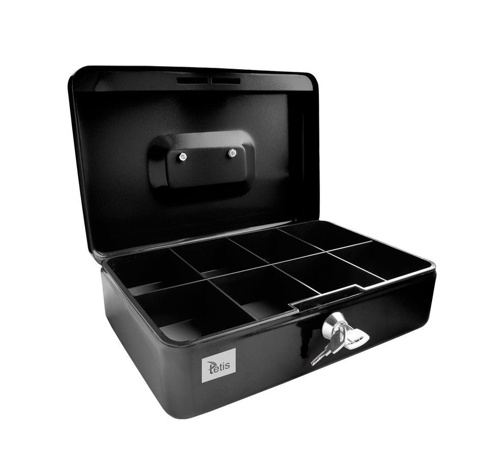 Kasetka metalowa w rozmiarze 8” ze składanym uchwytem do przenoszenia. Lakierowana obudowa. Jest wyposażona w tackę z ośmioma przegródkami. Posiada dodatkowy schowek pod wyjmowaną tacką. Zamknięcie na zamek bezpieczeństwa z dwoma kluczami.