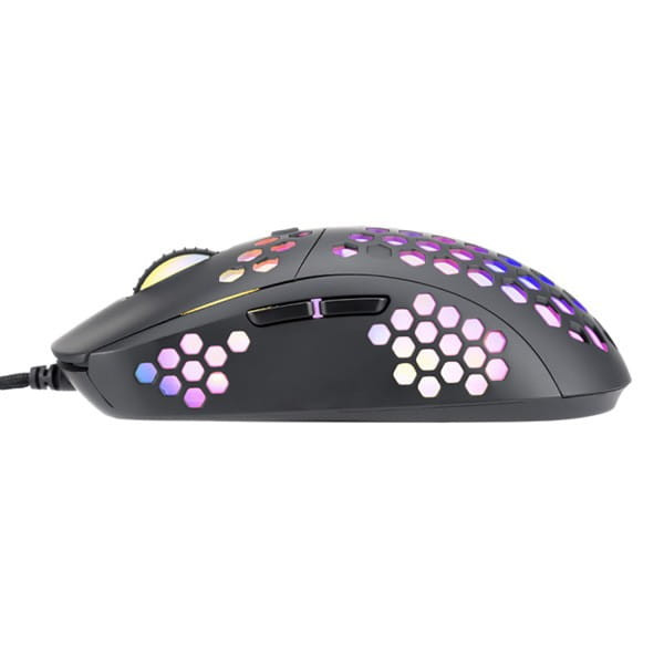 Symetryczny kształt z niewielkim wcięciem po środku, niska waga 76g pozwalają na wygodne uchwycenie i prowadzenie myszy. Za precyzję odpowiada sensor optyczny o regulowanej skokowo rozdzielczości od 800 do 6400 DPI. Po zainstalowaniu aplikacji użytkownik może samodzielnie ustawić 6 poziomów DPI od 500 do 6400.