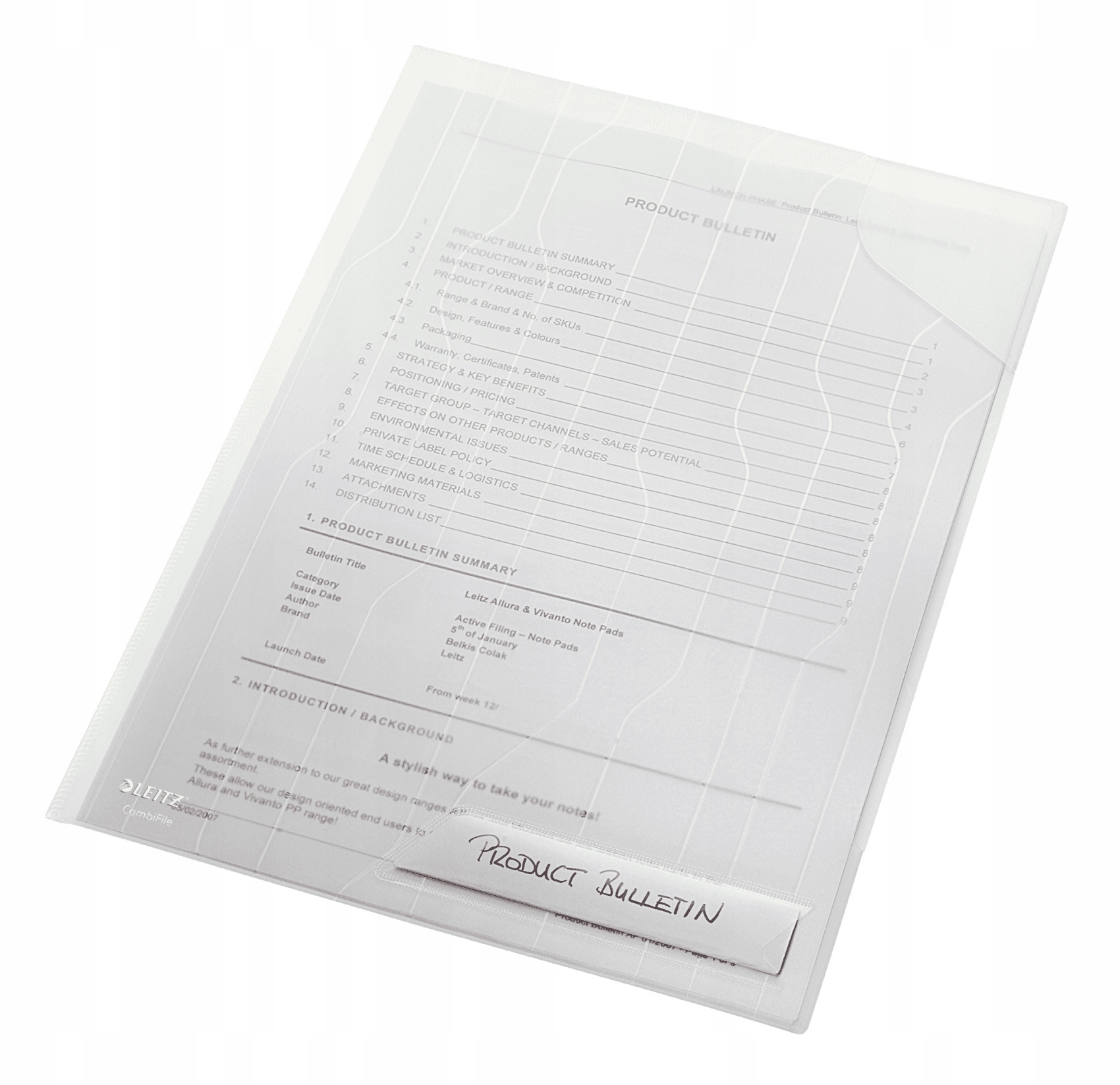 Folder z unikalnym skladanym paskiem z otworami do wpiecia w segregator. Zabezpiecza dokumenty przed wypadaniem dzieki naroznej kieszonce u góry oraz cześciowemu sklejeniu bocznej krawedzi, z boku z prawej strony. Atrakcyjne wzornictwo i tloczenie na folii polipropylenowej.