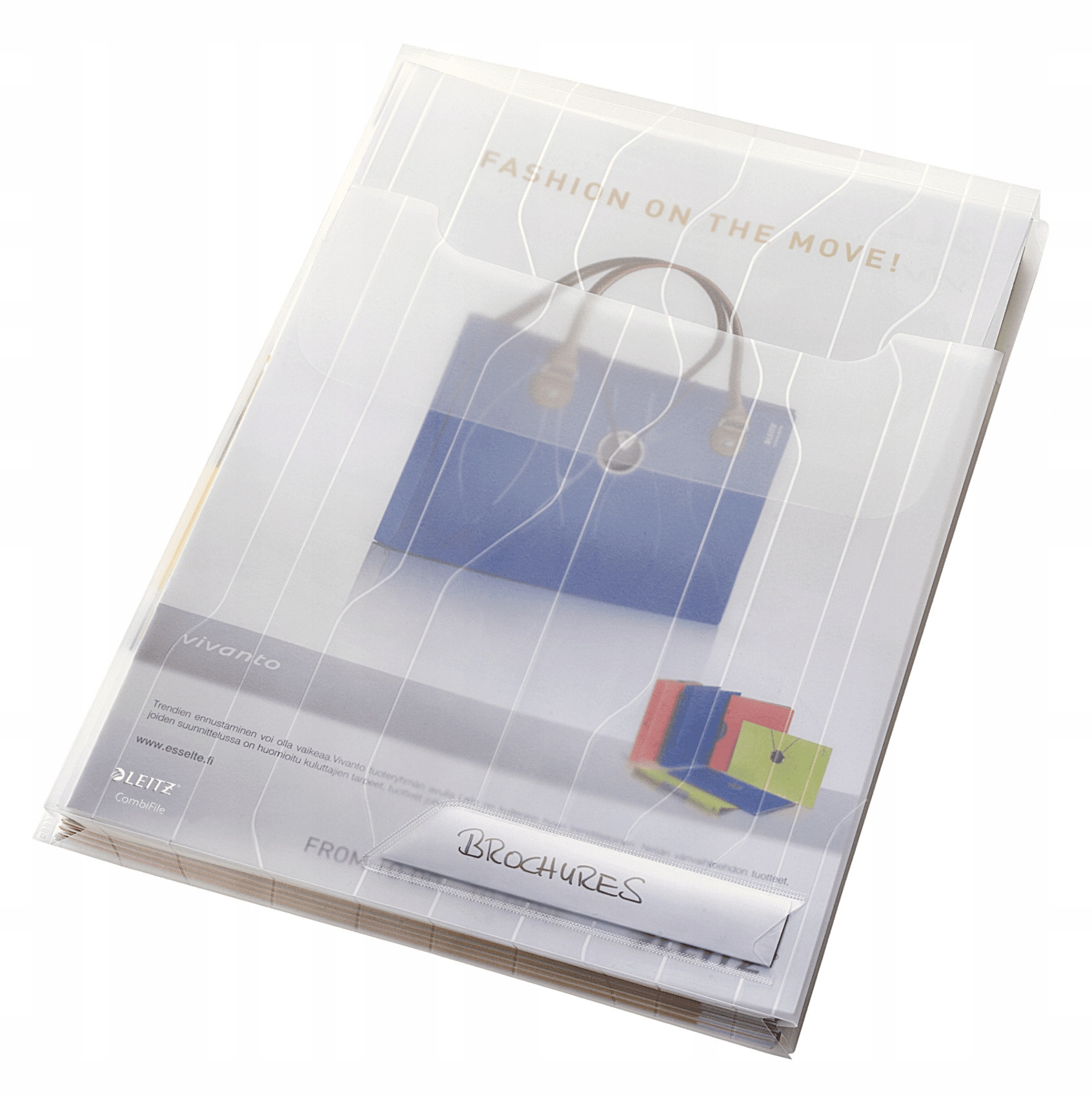 Zamykany klapką od góry dla zabezpieczenia dokumentów przed wypadaniem. Atrakcyjne wzornictwo i tloczenie na folii polipropylenowej.