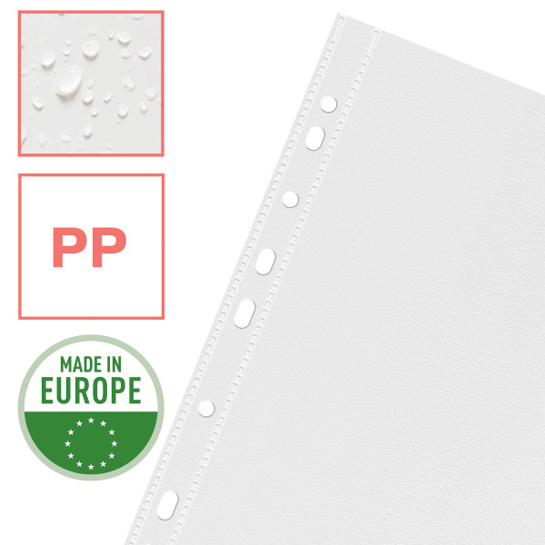 Wykonane z przezroczystej, groszkowej folii "copy safe". Kazda koszulka posiada uniwersalną listwe do wpinania, pasującą do wiekszości segregatorów.