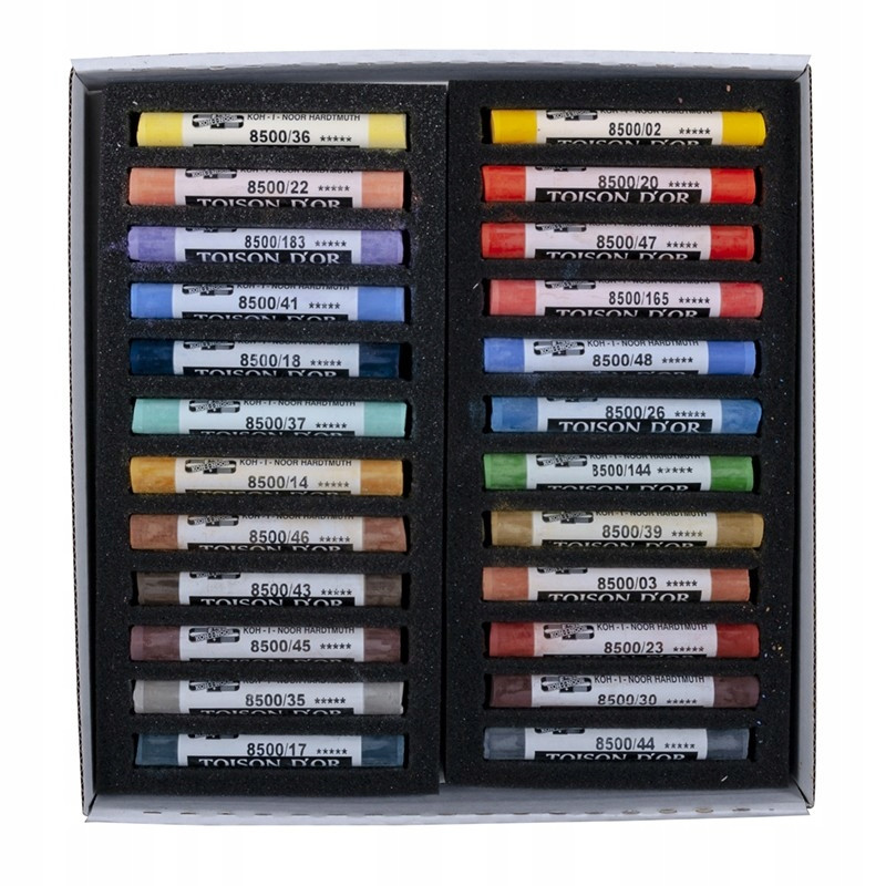 Pastele suche TOISON D'OR zostaly wyprodukowane z najwyzszej jakości skladników. Do ich wyprodukowania zostal uzyty bardzo trwaly i jednolity pigment oraz bardzo drobno sproszkowane naturalne substancje na bazie weglanu wapnia, mineralu kalcytu lub kredy.