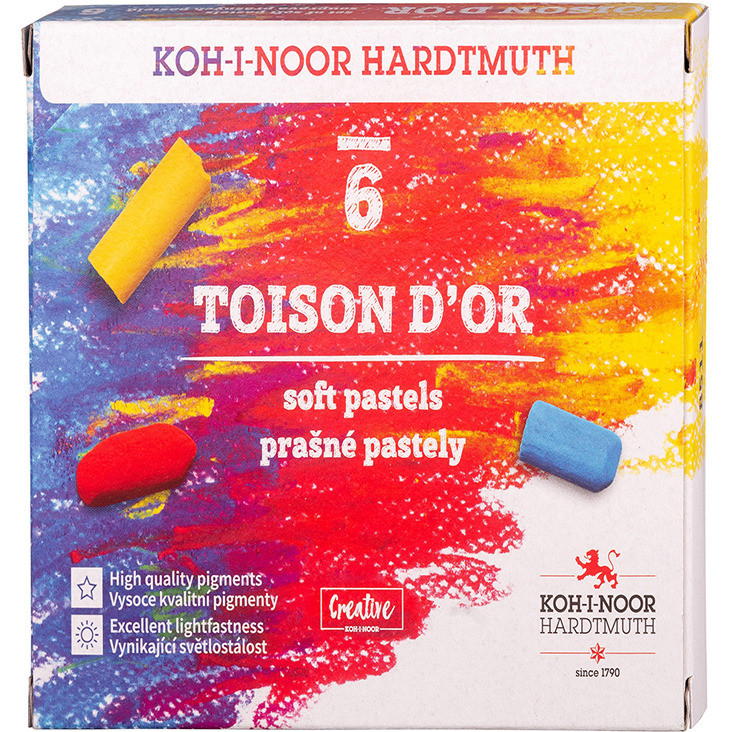 Pastele suche TOISON D'OR zostaly wyprodukowane z najwyzszej jakości skladników. Do ich wyprodukowania zostal uzyty bardzo trwaly i jednolity pigment oraz bardzo drobno sproszkowane naturalne substancje na bazie weglanu wapnia, mineralu kalcytu lub kredy.