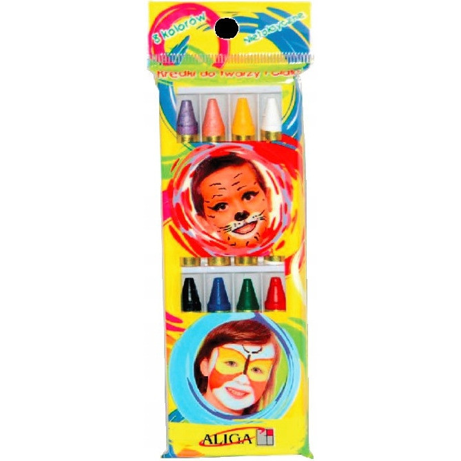Zestaw 8 kredek do malowania twarzy i ciala. Idealne na przyjecia dla najmlodszych. Dzieki nim namalujesz wiele wzorów np.: kotka, pieska, tygryska.