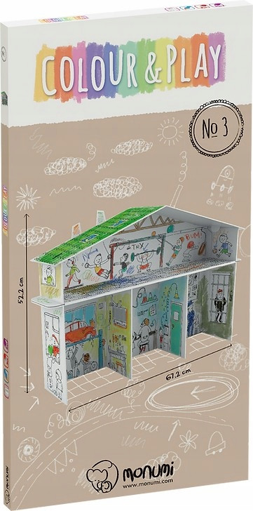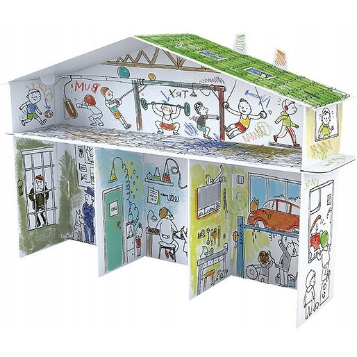 Przestrzenny, wielopietrowy domek-kolorowanka wykonany z wytrzymalej tektury oklejanej bialym kartonem. Duze, precyzyjnie wyciete elementy, latwe do zlozenia bez kleju czy nozyczek. Obrazkowa instrukcja na tyle opakowania. Ruchome cześci, okienka, otwarte przestrzenie, póleczki uatrakcyjniają konstrukcje. Zlozona konstrukcja jest stabilna, wytrzymala i lekka. Profesjonalna grafika, wy