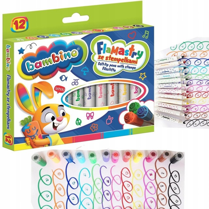 Zestaw flamastrów ze stempelkami marki Bambino to doskonały wybór dla dzieci ceniących sobie kreatywność i poszukiwanie nowych form wyrazu artystycznego. Każdy z 12 flamastrów wyposażony jest w unikalny stempelkowy wzór, co daje mnóstwo możliwości do twórczego ozdabiania rysunków, kartek okolicznościowych czy zaproszeń. Intensywne barwy flamastrów sprawią, że każdy projekt nabierze wyrazistości, a ich długa żywotność zapewni wiele godzin zabawy. Produkty są ł