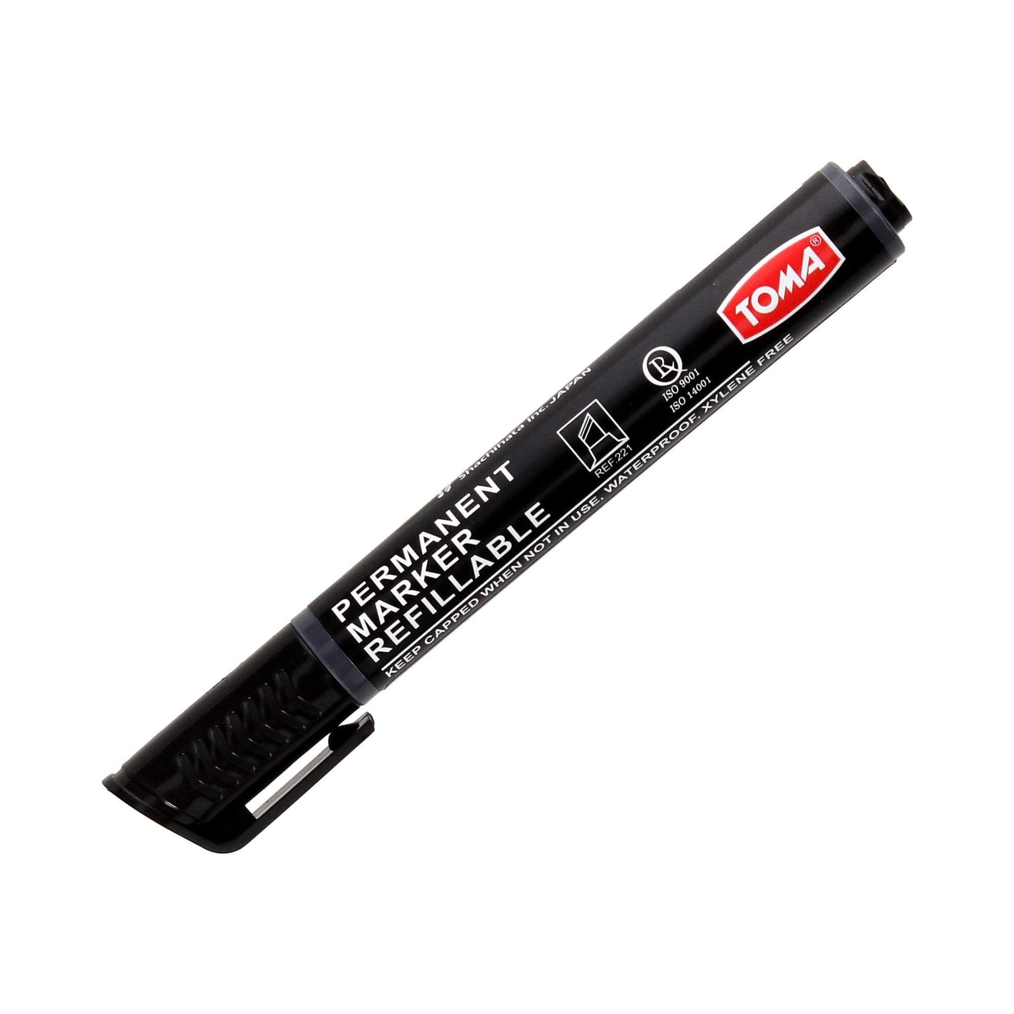 Marker permanentny Toma ściety czarny TO-221 Marker permanentny napelnialny z tuszem wodoodpornym, nie zawierający ksylenu i toluenu. Do pisania po wszystkich powierzchniach. Certyfikaty ISO 9001, ISO 14001. Japonska technologia i produkcja. Bardzo latwe otwieranie. Do ponownego napelnienia wystarczy kilka kropli tuszu.