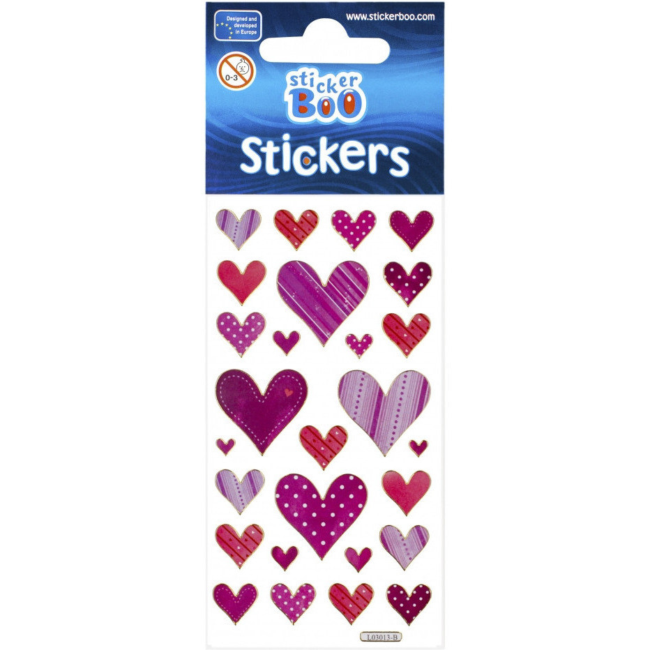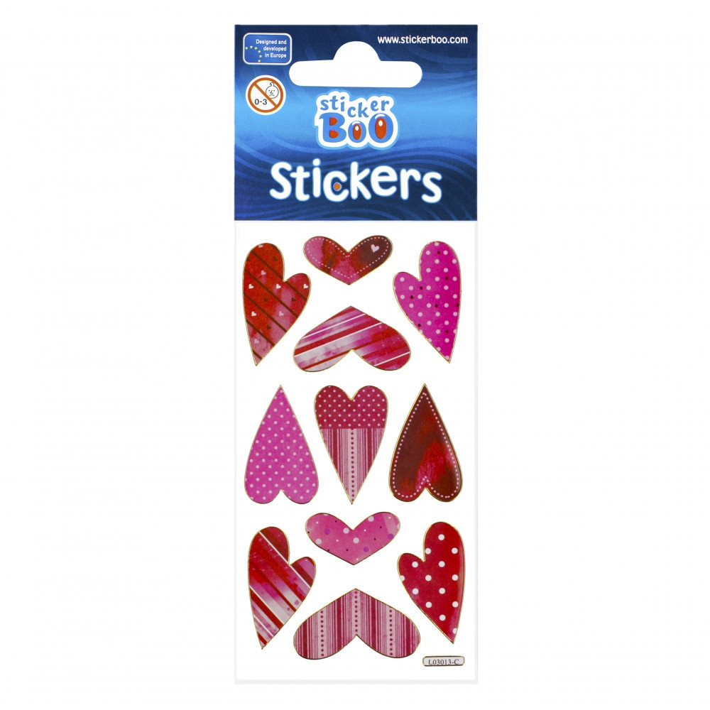 Naklejki STICKER BOO z grafiką z Sercami z pewnością przypadną do gustu dzieciakom, idealne do zdobienia rysunków, wszelkiego rodzaju prac plastycznych oraz kolekcjonowania, naklejki ze zlotą obwódką.