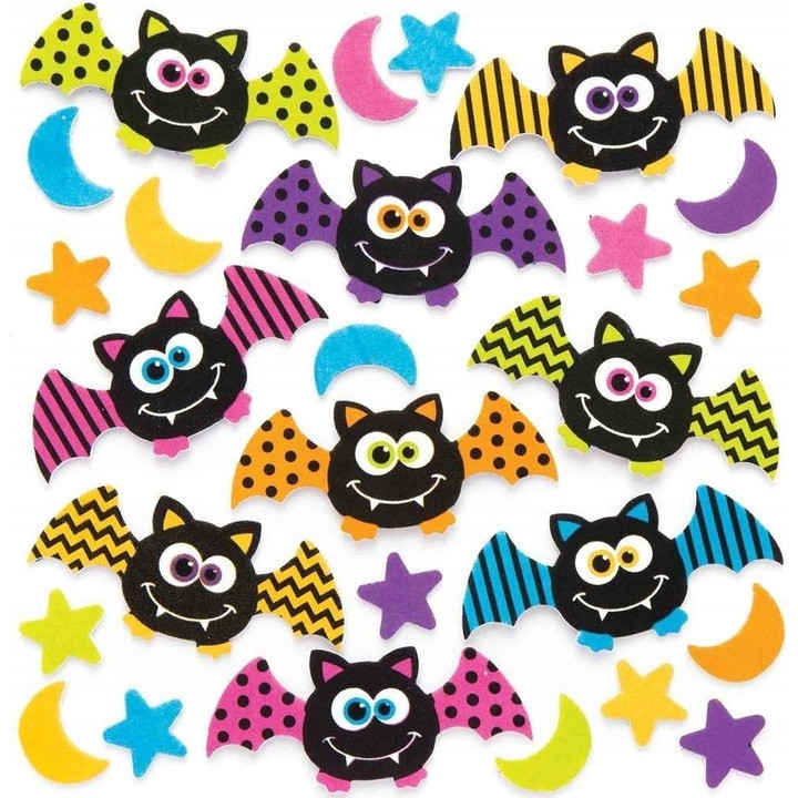 Kolorowe naklejki przedstawiają przyjazne nietoperze, idealne do udekorowania pokoju Twojego dziecka lub na przyjecie w stylu Halloween.