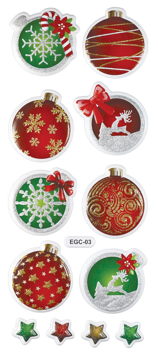 Naklejki wypukłe miękkie. Wzór: bombki, gwiazdki. Bombki o średnicy 35 mm, gwiazdki o wymiarze 14 mm. 12 sztuk.