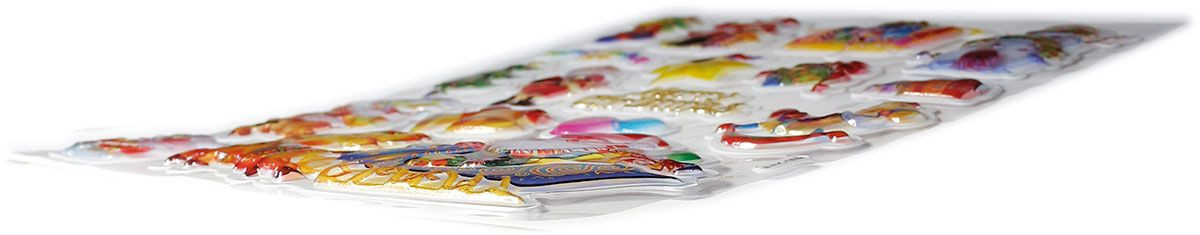 Naklejki wypukłe, wzór: Mikołaje, bałwanek, sanie, prezenty, napis Merry Christmas. 17 sztuk.