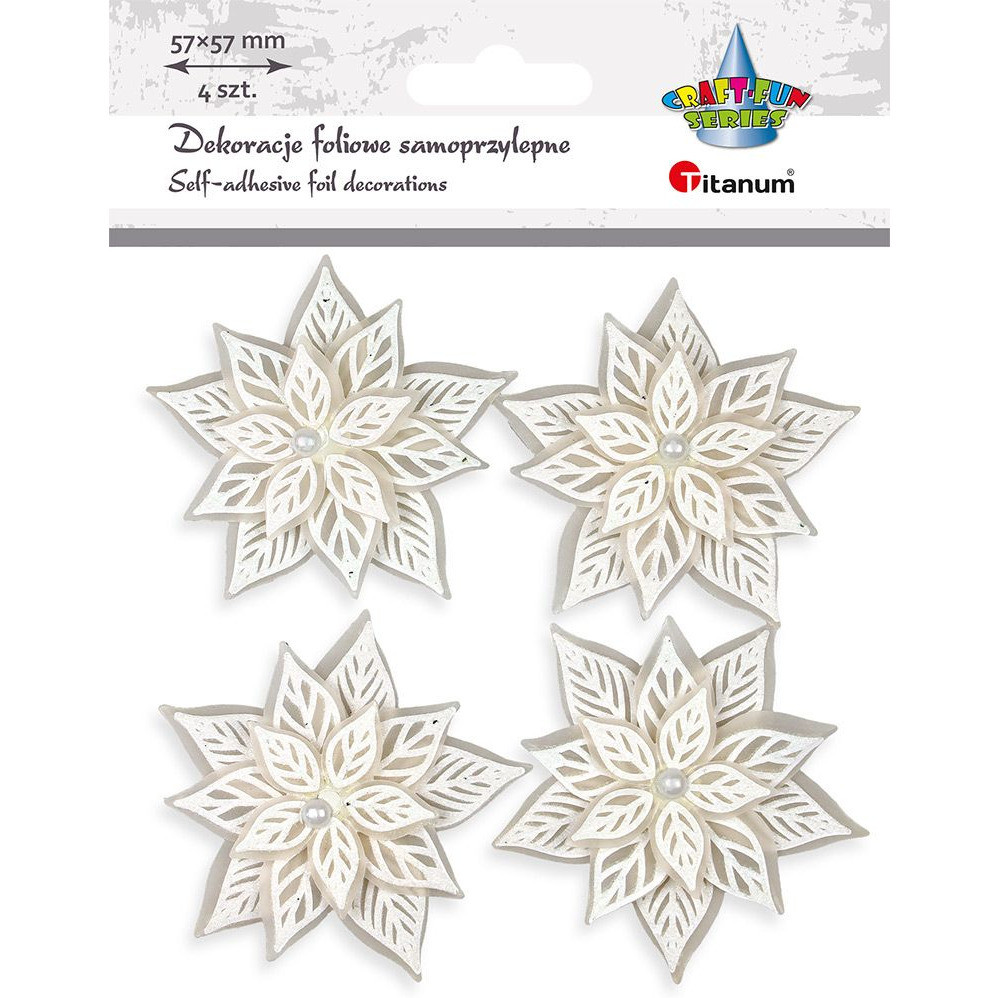 Dekoracje samoprzylepne, foliowe, 3D, wzór: poinsecje, wymiary: 60 x 57 mm, kolor: białe, z perełką. 4 sztuki.