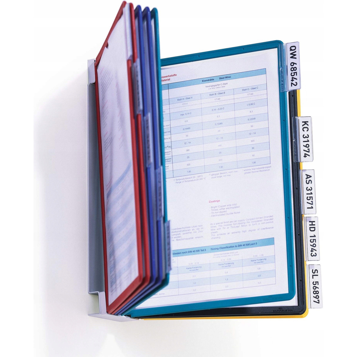 Uchwyt naścienny z 10 panelami prezentacyjnymi SHERPA w formacie A4, po 2 sztuki w kolorze czarnym, czerwonym, zóltym, zielonym i granatowym. Przeznaczony szczególnie do warsztatów, sal sprzedazowych i ekspozycyjnych.