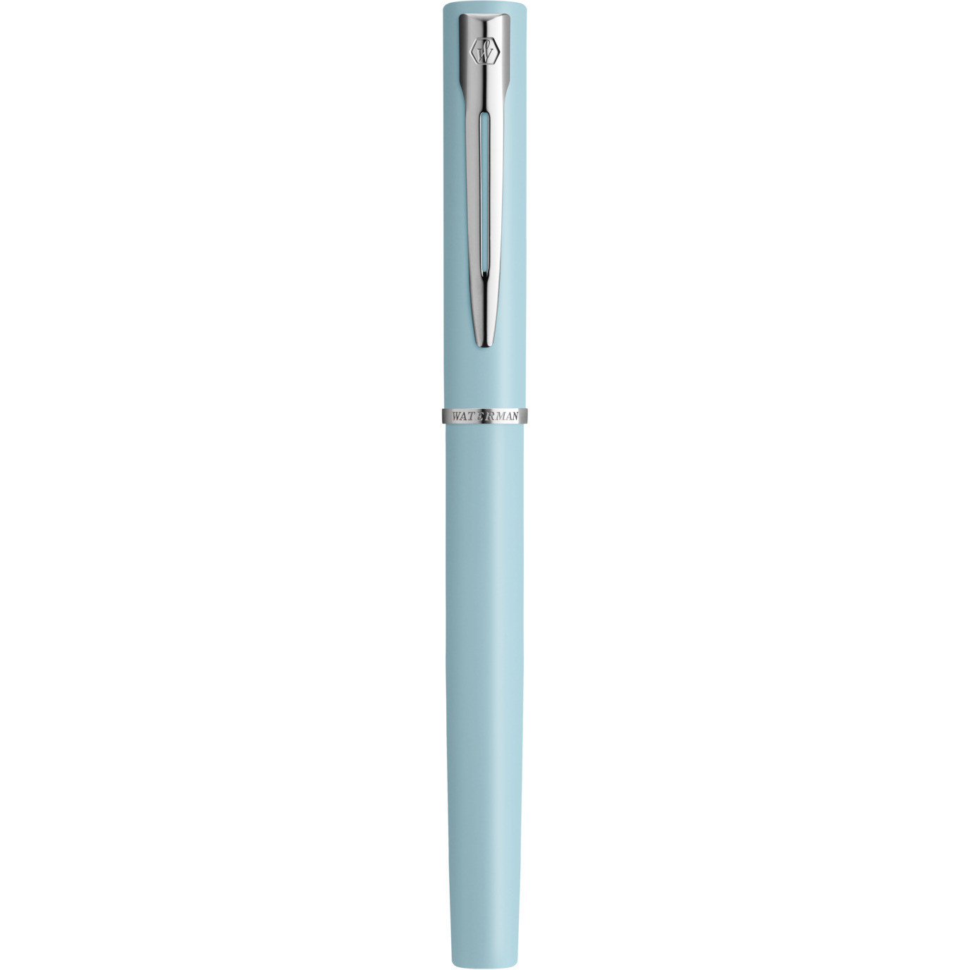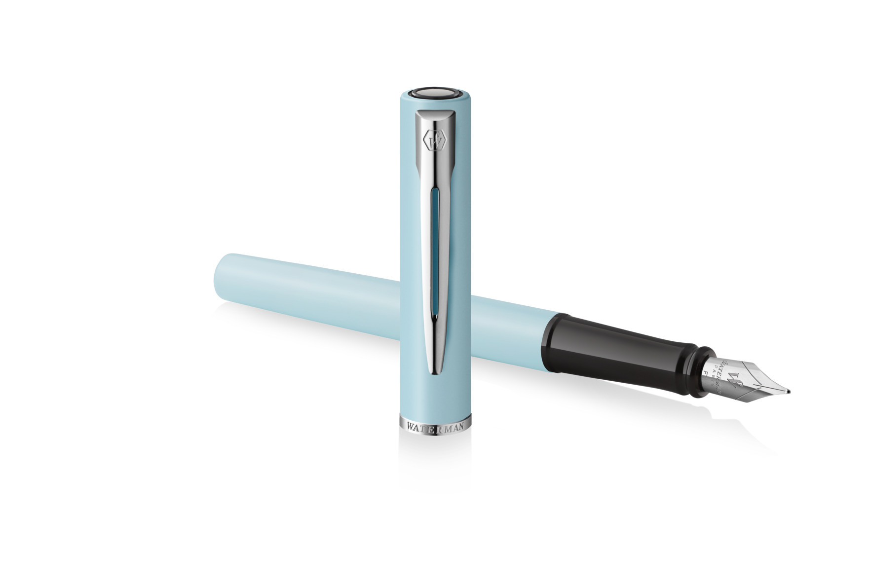 Waterman Allure pióro wieczne Baby Blue Matte Lacquer CT, matowoniebieskie z chromowanymi wykończeniami, stalówka fine ze stali szlachetnej, niebieski atrament, opakowanie prezentowe Metalowy korpus i wykończenie matowym, pastelowym lakierem podkreśli Twój wyrafinowany stylWyrafinowany korpus ze szczotkowanej stali szlachetnej, gładkie wykończenia z 23-karatowego złotaWyposażone w żywy, niebieski atramentOdpowiednie do krótkich lub długich nabojów WatermanDoskonałe dla studentów i profesjonalistów; w opakowaniu prezentowym WatermanPióro wieczne Waterman Allure to nowoczesny, stylowy design odp