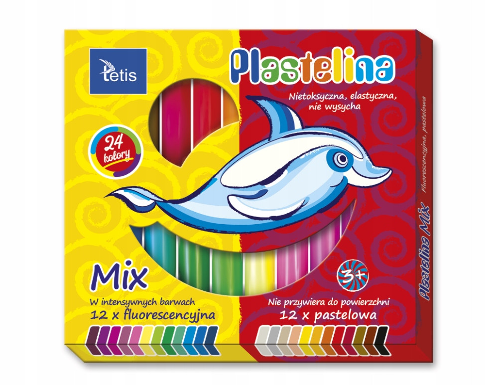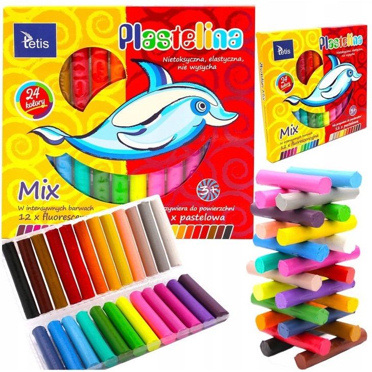 Zestaw zawiera 24 kolory plasteliny - w tym 12 pastelowych i 12 fluorescencyjnych.