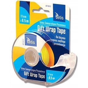 Taśma prezentowa z podajnikiem do taśmy o szerokości do 19 mm. Do klejenia papieru zwyklego i prezentowego. Mozna po niej pisac. Odrywa sie bez uzycia nozyczek. Niewidoczna na kserokopiach.