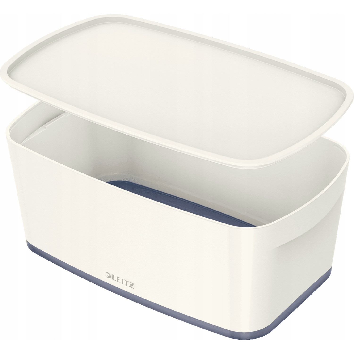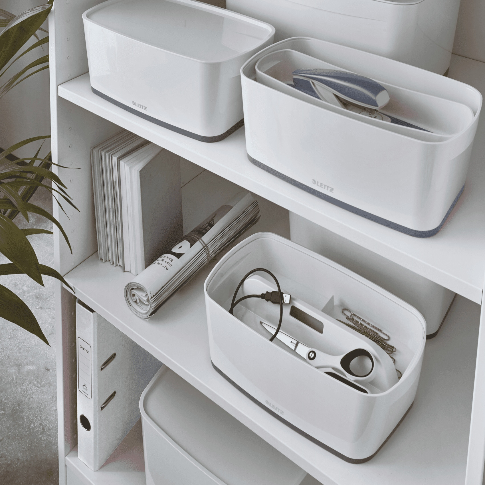 Pojemnik Leitz MyBox, z systemem modulowego ustawiania, stwarza mozliwośc eleganckiego przechowywania akcesoriów w domu lub biurze.
