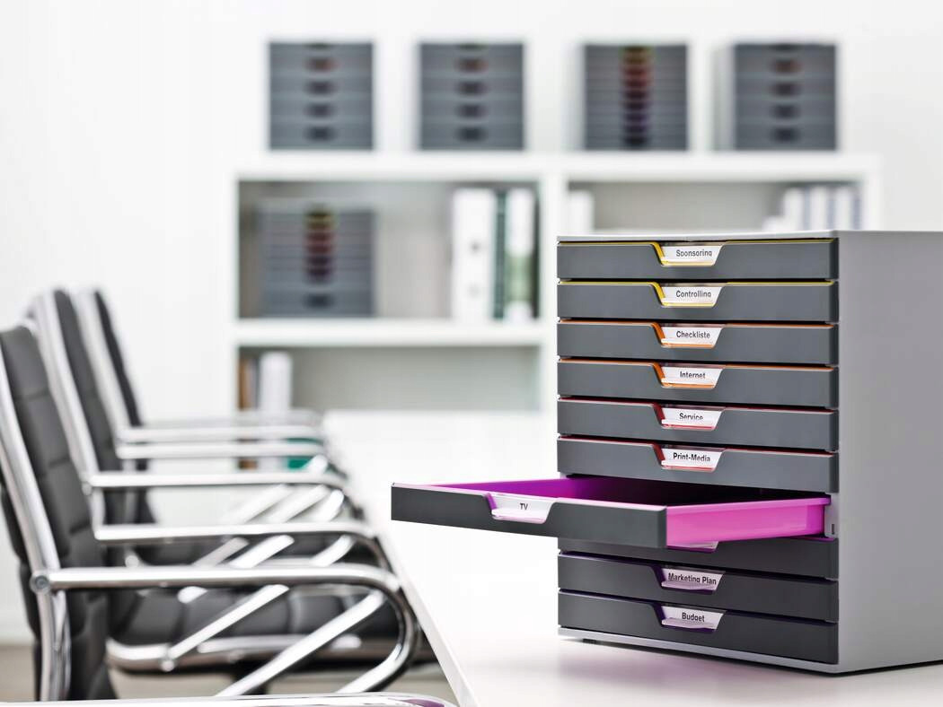 Pojemnik z 10 kolorowymi szufladami umozliwiający segregacje i latwą orientacje w dokumentach. Wykonane z najwyzszej jakości tworzywa ABS.