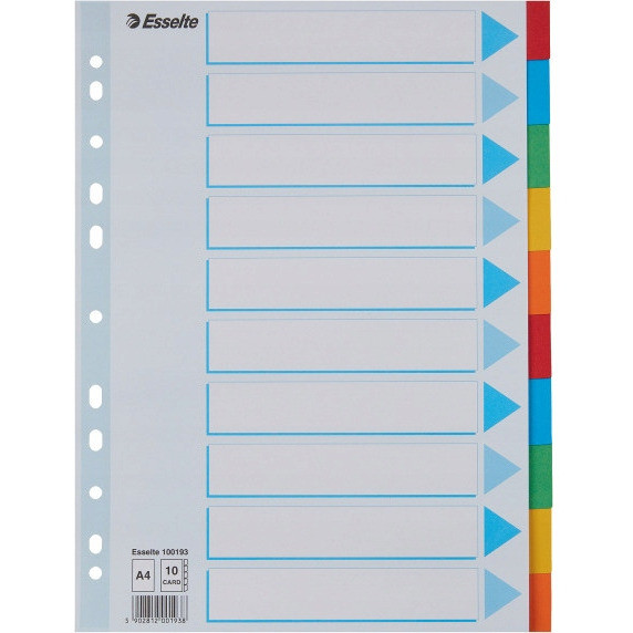 Wytrzymale przekladki, utrzymane w zywej tonacji kolorystycznej. Wykonane z kartonu pochodzącego z odzysku. Wierzchnia karta z wydzielonymi, duzymi powierzchniami na opisy.