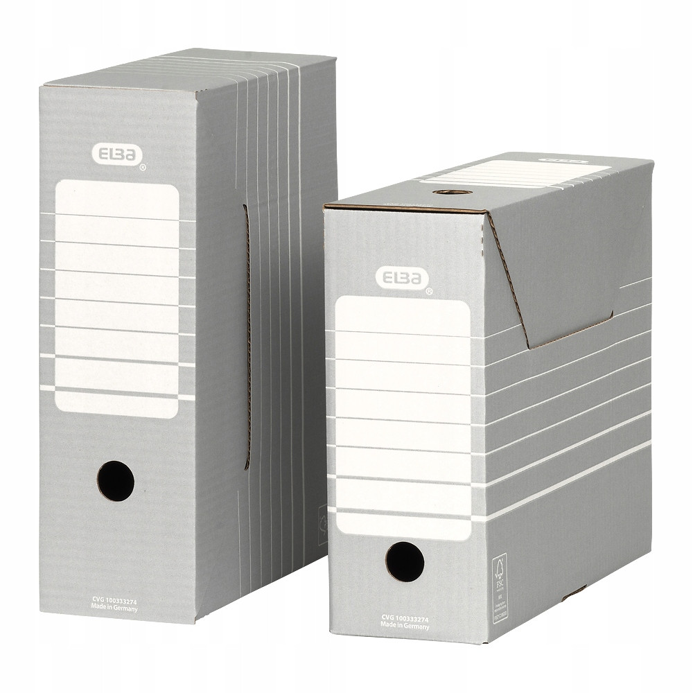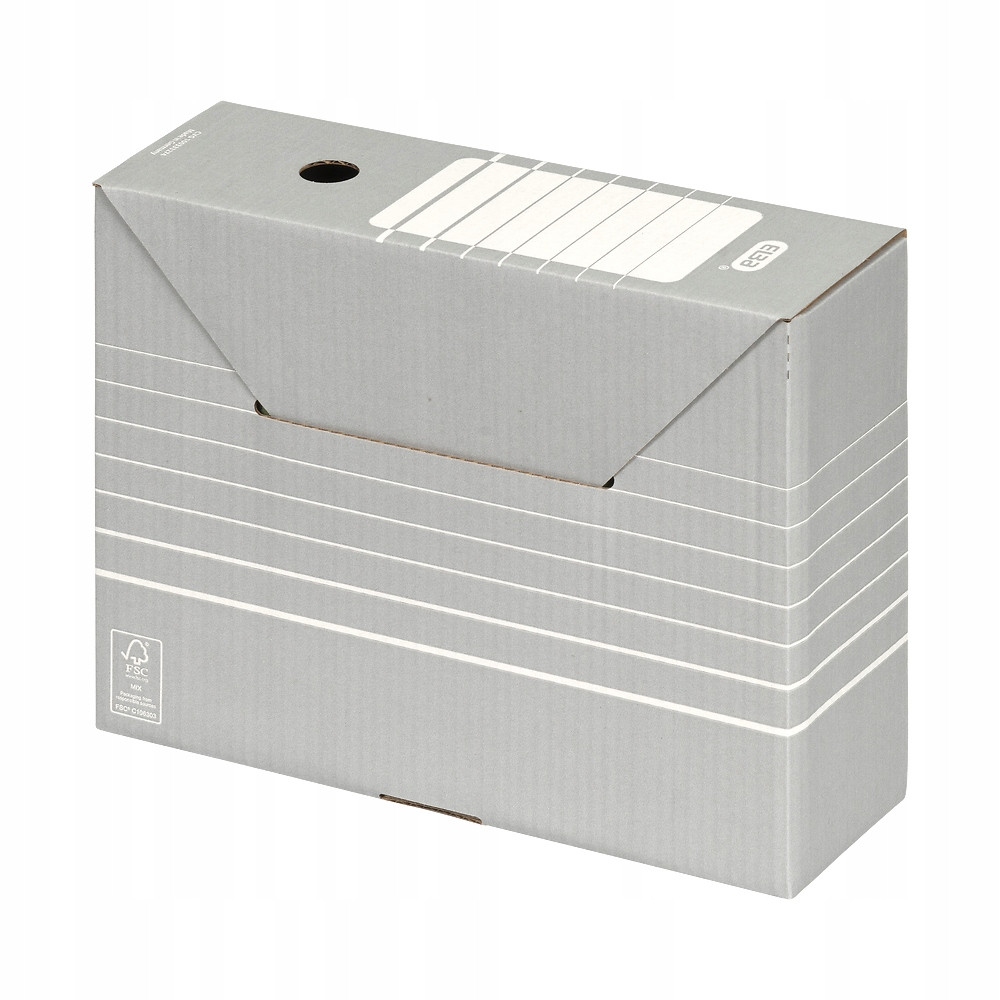 Okrągly otwór na grzbiecie ulatwia przenoszenie kartonu. Perforacja w górnych bokach umozliwia przechowywanie teczek zawieszkowych. Kartony są bezkwasowe, co zapewnia bezpiecz