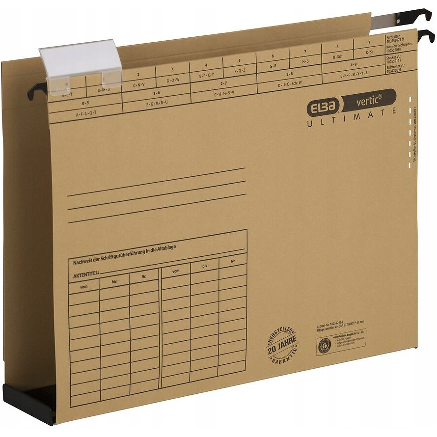 Na dnie teczki znajduje sie plastikowa wkladka z bocznymi ogranicznikami, zabezpieczającymi dokumenty przed wypadaniem. Przesuwny szyldzik z wymiennymi etykietami opisowymi w zestawie. W środku umieszczono dwie pary naciec do pasków skoroszytowych.